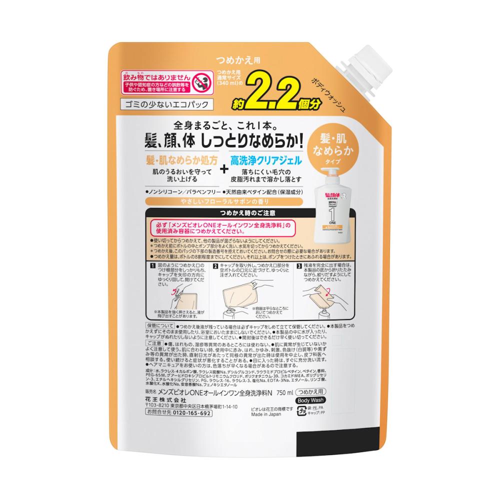 使用上の注意:必ず「メンズビオレONEオールインワン全身洗浄料」の使用済み容器につめかえてください。 ●使い切ってからつめかえて、他の製品が混ざらないようにしてください。 *つめかえ前にボトルの中とポンプ部分をよく洗い、水気を切ってからつめかえてください。 *つめかえ後、このパックの下部の製造番号を控えておいてください。お問合せの際に必要な場合があります。 ●つめかえ量は、ボトルの8割程度までにしてください。それ以上は、ポンプをつけたときにあふれる場合があります。 ご注意 ●傷、はれもの、湿疹等異常のあるところには使わない。 ●肌に異常が生じていないかよく注意して使う。肌に合わない時、使用中に赤み、はれ、かゆみ、刺激、色抜け(白斑等)や黒ずみ等の異常が出た時、直射日光があたって同様の異常が出た時は使用を中止し、皮フ科医へ相談する。使い続けると症状が悪化することがある。 ●目に入った時は、すぐに充分洗い流す。 ●ヘアマニキュアをお使いの方は、色落ちが早くなる場合があるので注意する。