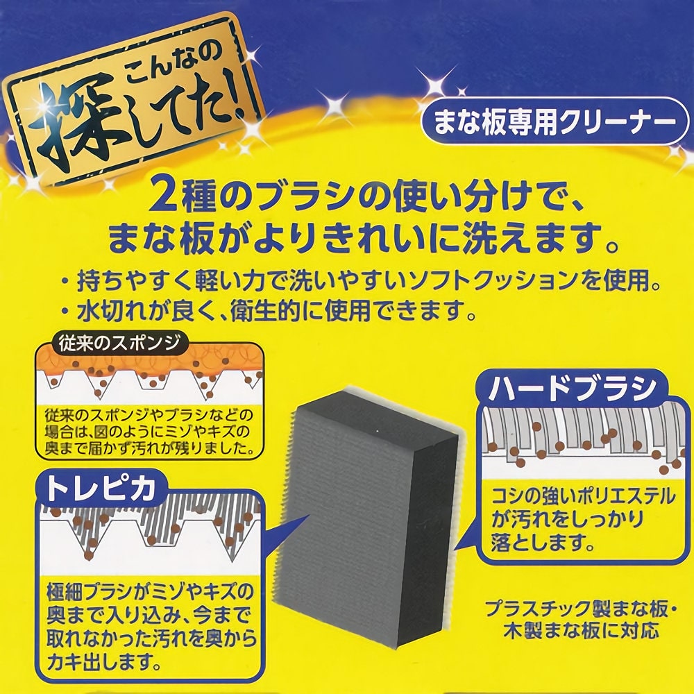トレピカはキズの中に入り込んだ細かい汚れに、ハードブラシはこびりつきなどのガンコな汚れに対応します。 ポリエチレンに貼りあわせているので、程よい硬さで洗いやすいです。水切れも良く衛生的です。