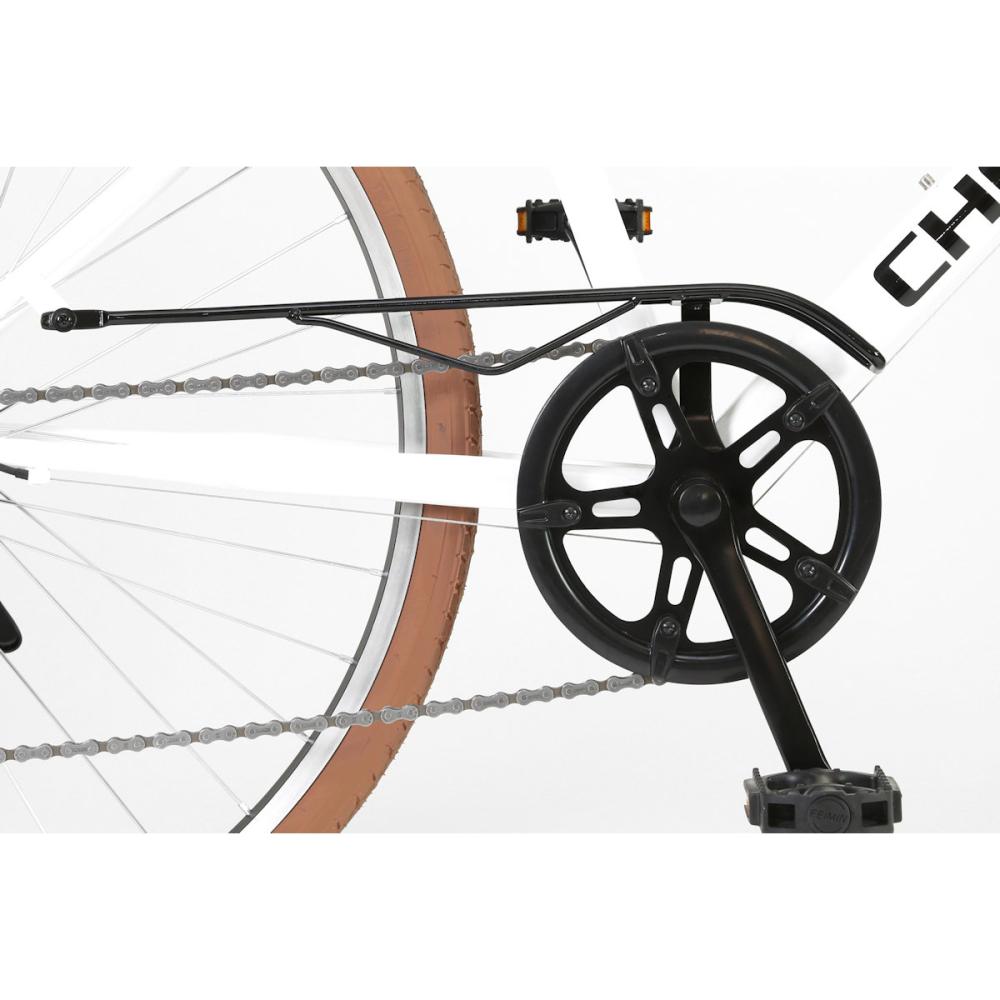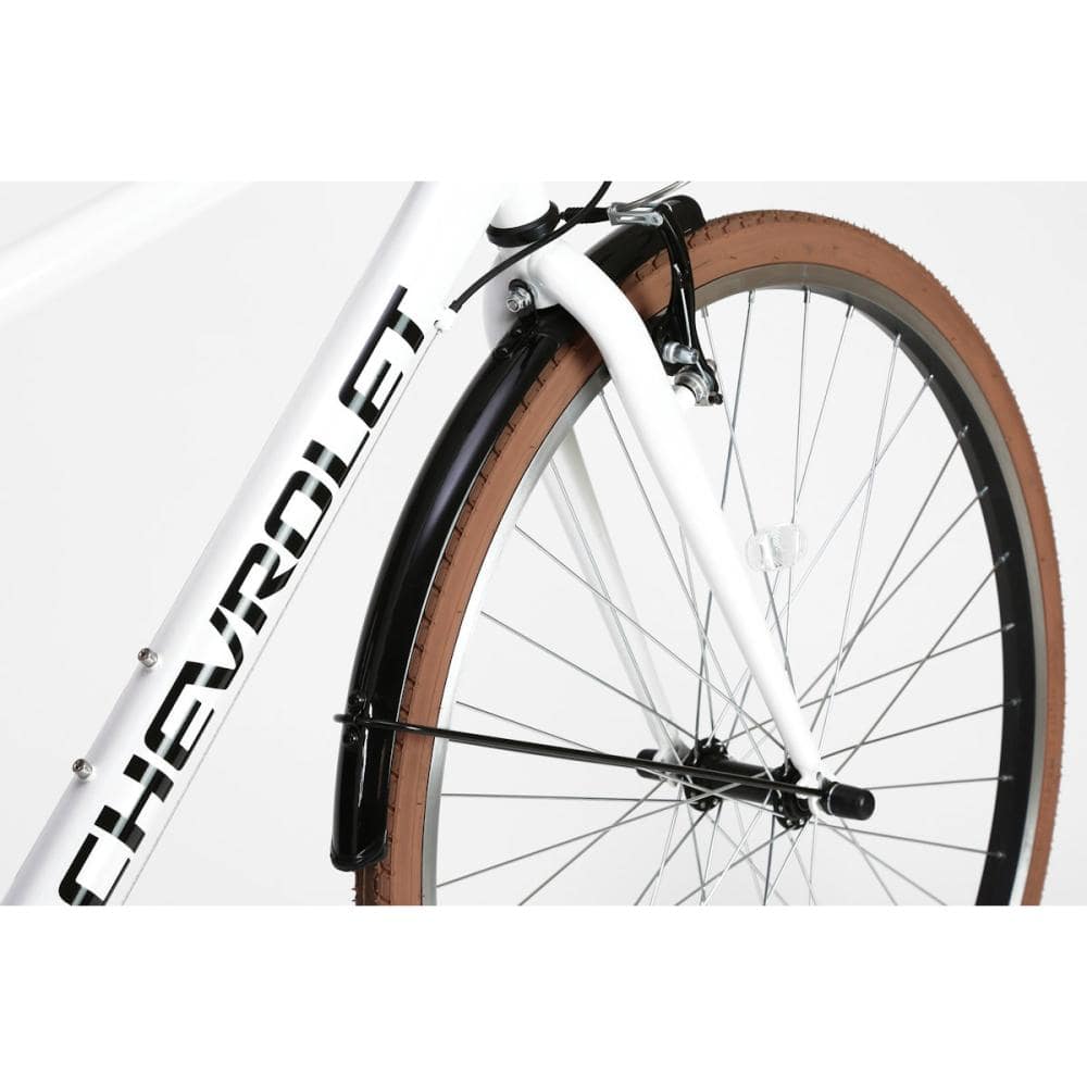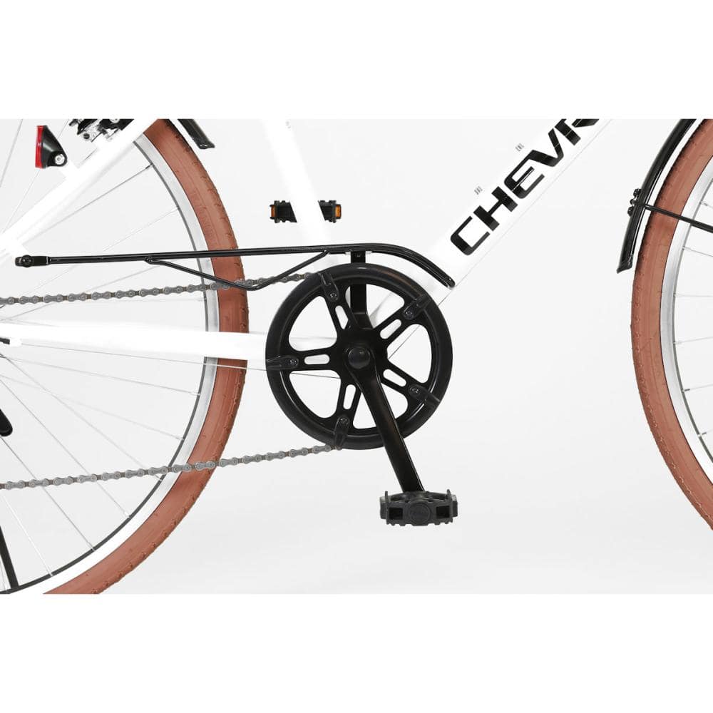 700×32C、6段変速搭載、前後Vブレーキ、チェーンカバー、前後フェンダー、LEDライト、ブラウンタイヤ