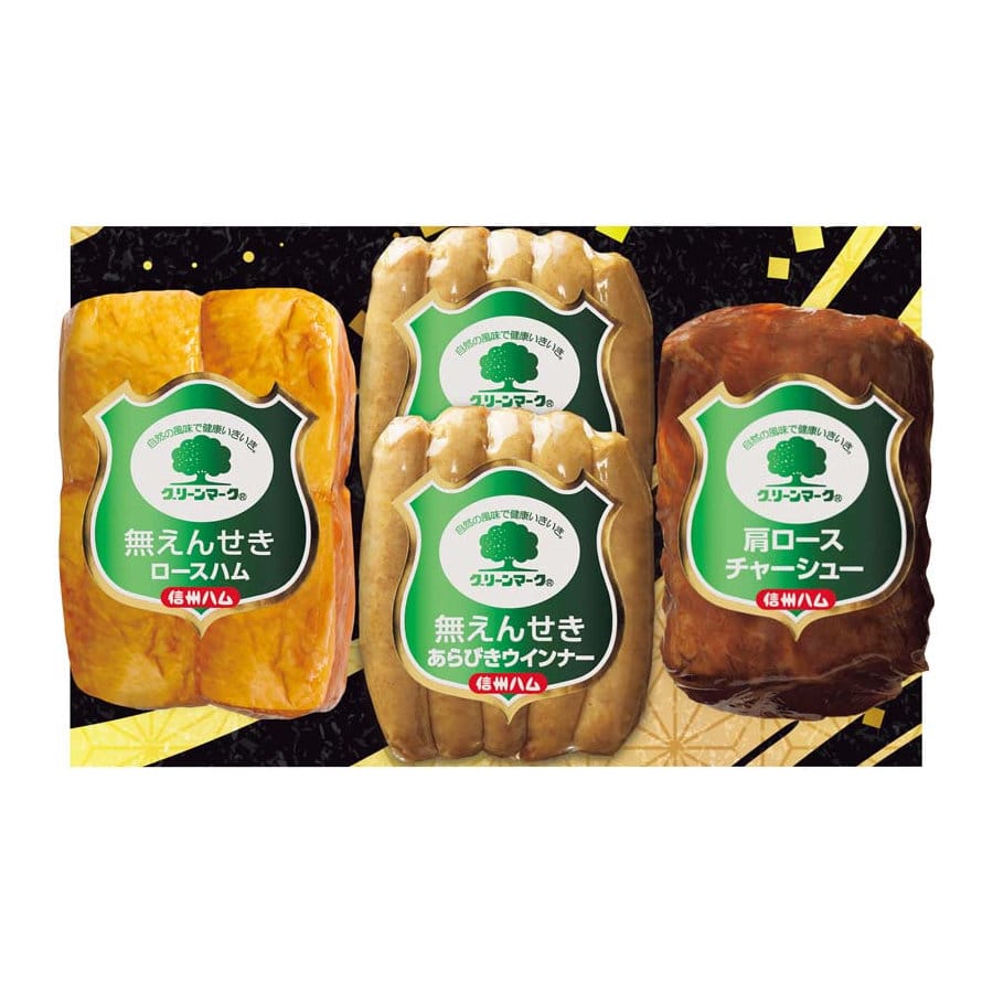 【セット内容】グリーンマーク糸巻きロース300g、グリーンマーク肩ロースチャーシュー190g、グリーンマーク粗挽ポークウインナー100g×2