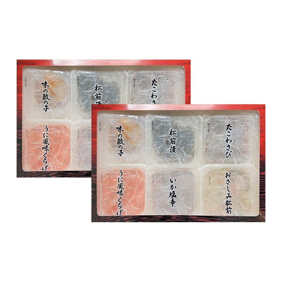 【セット内容】(いか塩辛、松前漬、おさしみ松前、うに風味くらげ、味の数の子、たこわさび各50g)×2セット