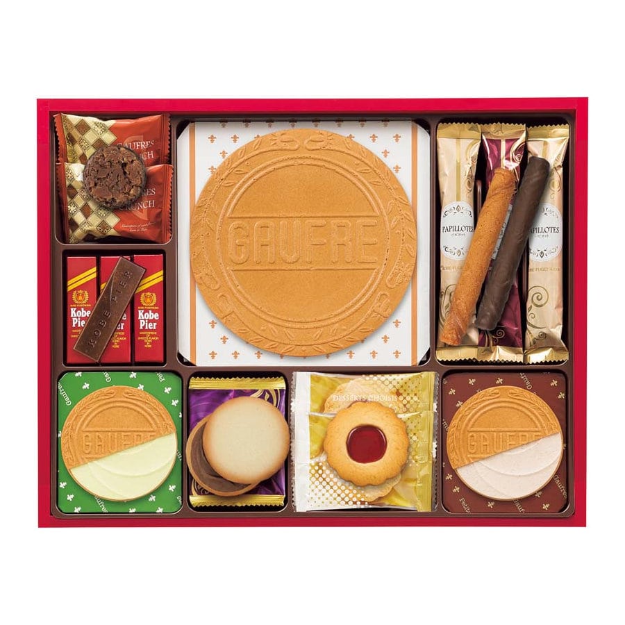 【セット内容】ゴーフル3枚(V、S、C3枚入×1袋)、ゴーフル、オ、グーテ抹茶2枚(2枚入×1袋)、プティーゴーフル、オ、グーテ6枚(抹、紅各3枚(3枚入×1袋))、パレ、オ、ショコラ4枚、パピヨット4本、チョコレートパピヨット2本、ジャムトップクッキー2枚、ゴーフルクランチ2個、コウベピアー3本