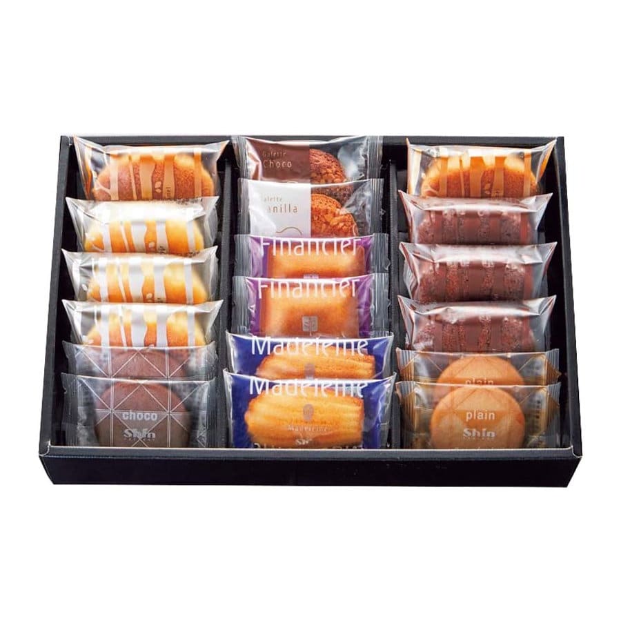 【セット内容】18個:スフレ(フロマージュ、ショコラ)各3個、マドレーヌ、フィナンシェ、スフレキャラメル、サブレ(プレーン、チョコ)各2個、ガレット(バニラ、チョコ)各1個
