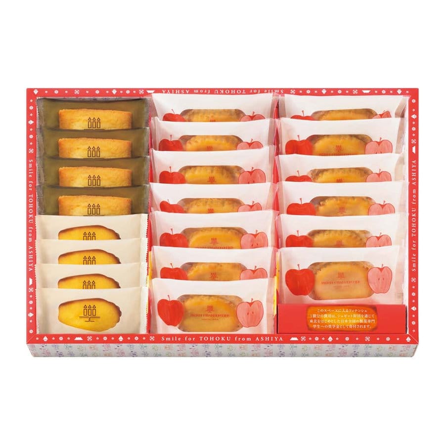 まろやかでコクのある蔵王のクリームチーズと、青森県産※のみずみずしく爽やかな甘みの林檎でく作ったジャムを使用し、しっとりとりと焼き上げたケーク、フロマージュ<林檎>。アンリ、シャルパンティエ定番のフィナンシェとマドレーヌに東北産の美味しさを使ったお菓子の詰め合わせです。あえてフィナンシェを1つ減らした商品を正かでご購入いただき、フィナンシェ1個分の金額をお客様からの寄付に、そして募金と同額をアンリ、シャルパンティエからも寄付しています。※使用しているりんご総量のうち、青森県産りんごを44%使用しています