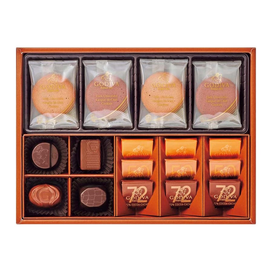 選び抜かれたチョコレートとスクエアタイプのシンプルなカレ、チョコレートをサンドしたラングドシャクッキーなど、ゴディバのバラエティ豊かな商品を一度に楽しめる詰め合わせです。