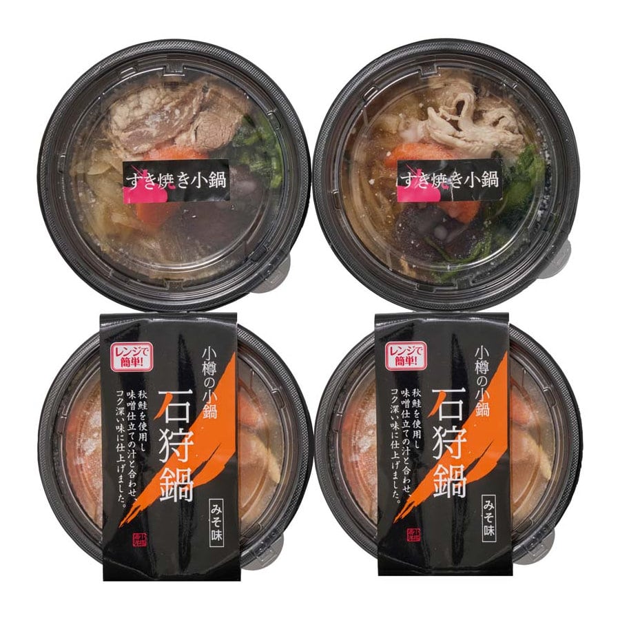 レンジで簡単にできる小鍋ギフト。北海道産牛を使用したすき焼き小鍋2食と、3種類の小鍋が選べるギフトです。エビや鮭に野菜が入った石狩鍋です。