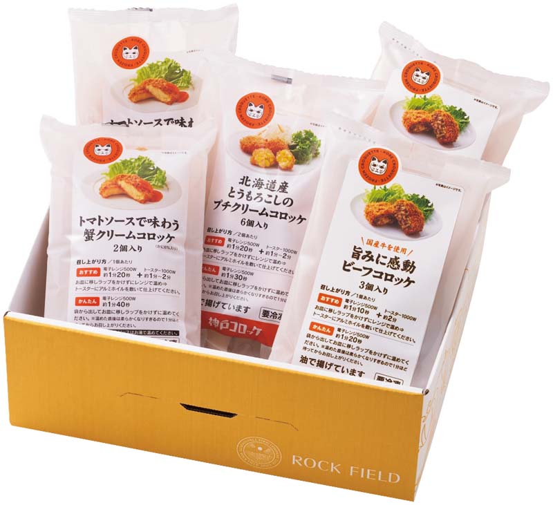 神戸コロッケで人気の単品3種類の詰め合わせ。とうもろこしの自然な甘み、蟹の美味しさをギュッと濃縮したベシャメルソースの蟹クリームコロッケ、牛肉の旨みがあふれるビーフコロッケの3種セット。