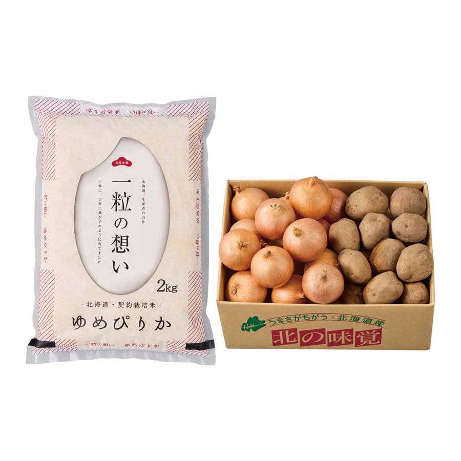 北海道のブランド米「ゆめぴりか」ときたあかりの有数な産地であるニセコ産のきたあかりに玉ねぎ生産量日本一の北見産の玉ねぎをセットしました。
