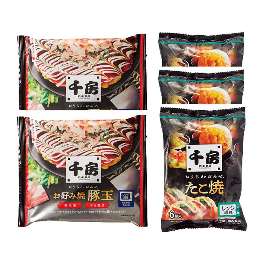 【セット内容】お好み焼豚玉220g×2、たこ焼180g×3、濃厚ソース25g、ホワイトソース(マヨネーズ風味)10g×各5、かつお節1g、あおさ0.2g×各2