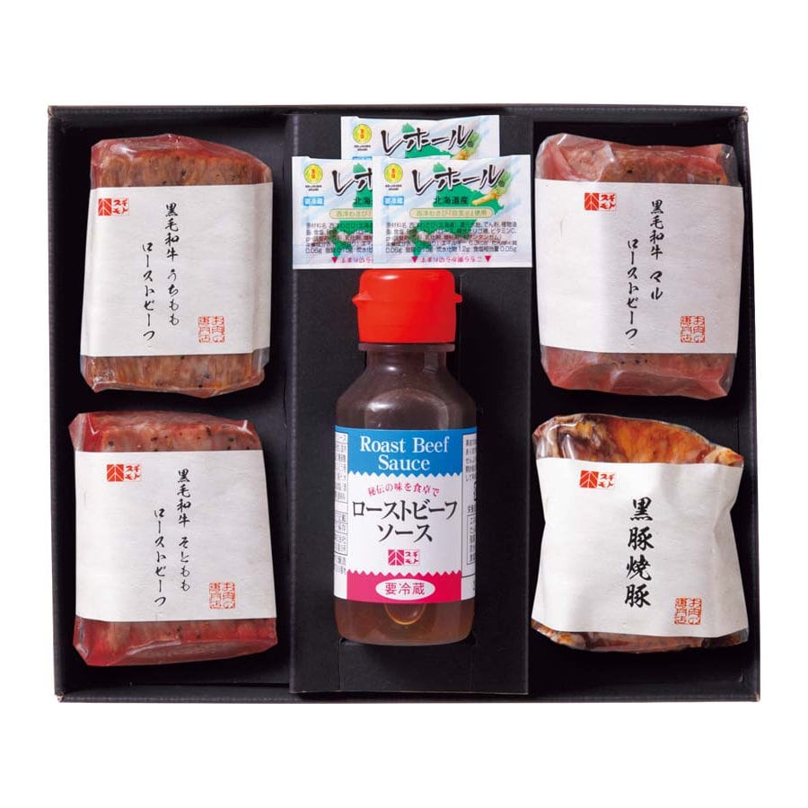【セット内容】黒毛和牛(うちもも、マル、そともも)各100g、黒豚焼豚100g、ローストビーフソース100ml、レホール3g×3