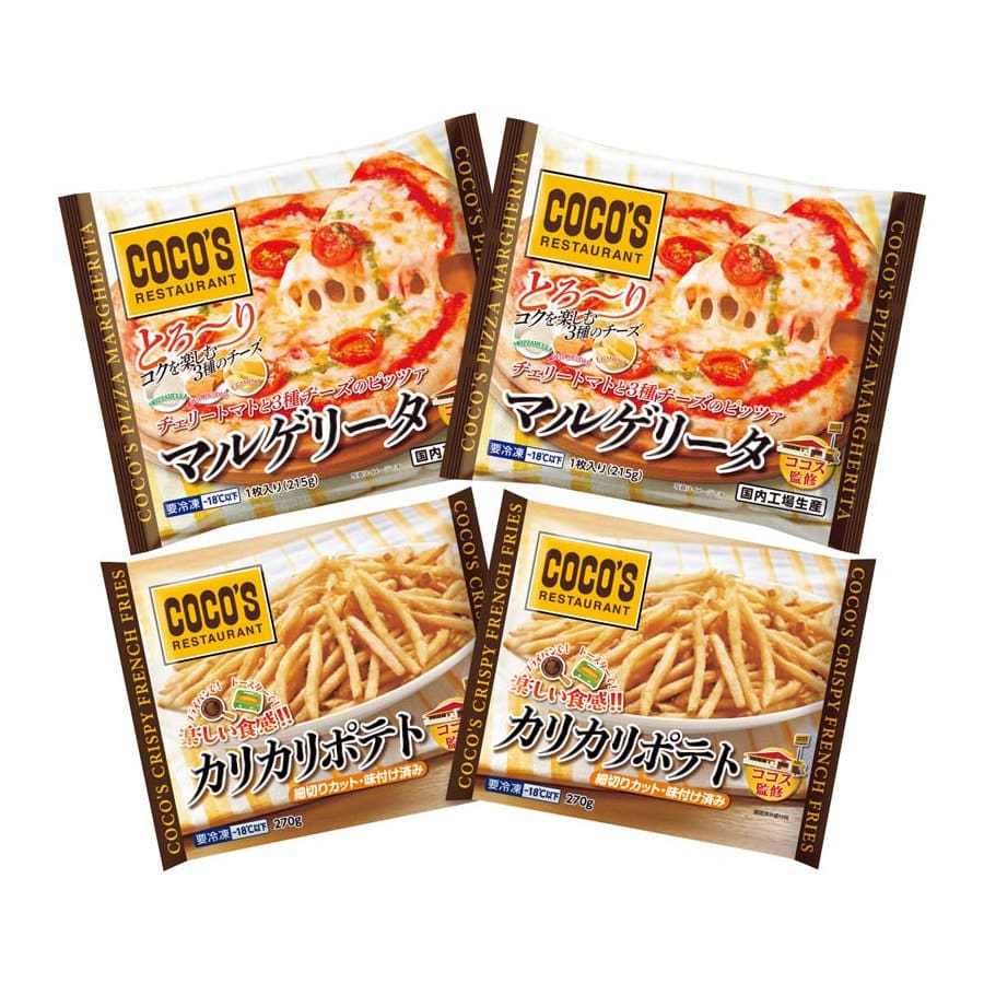 【セット内容】ココス監修チェリートマトと3種チーズのマルゲリータ1枚(215g)×2、カリカリポテト270g×2