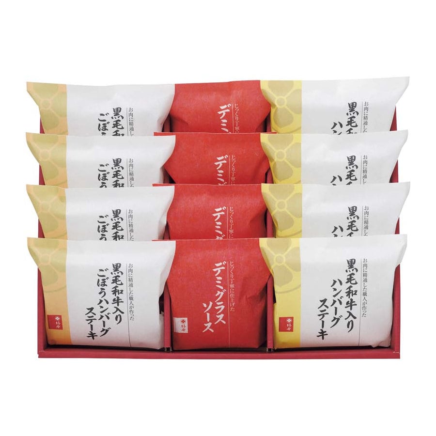 【セット内容】黒毛和牛入りハンバーグステーキ140g×4、黒毛和牛入りごぼうハンバーグステーキ140g×4、デミグラスソース30g×8