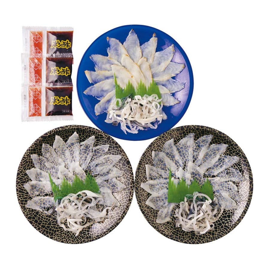 【セット内容】とらふぐ(国産)19cm×2p、真ふぐ(国産)たたき刺身19cm×1p、とらふぐ本皮約15g×3p、ポン酢12g×3p、もみじおろし3g×3p