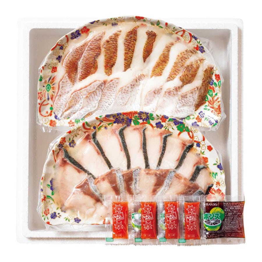 【セット内容】天然真鯛しゃぶしゃぶ用切身150g、天然ぶりしゃぶしゃぶ用切身150g、ぽん酢、もみじおろし×4