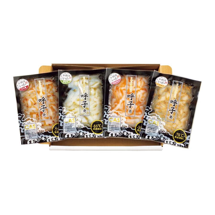 柔らかく甘みのある剣先いかを4種の味でお楽しみ頂けるお刺身セットです。CAS凍結という特殊冷凍技術でいかの甘みや旨みを逃さずパックしています。お酒の肴、ご飯のおともにぴったりです。