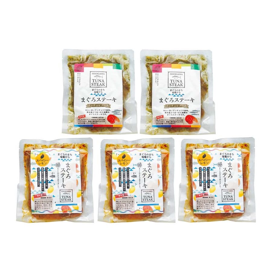生のめばちマグロ水揚げ日本一を誇る塩釜港水揚げのマグロを贅沢にステーキにしました。フライパンで表面をカリッと焼いてお召し上がりください。スパイシーレモン味とアンチョビ風味の詰合せです。