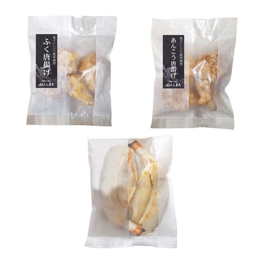 電子レンジで簡単調理。あっさりした味わいのあんこうと身がやわらかくプリッとしたしろさばふくを使用した唐揚げ、オリジナルの出汁に漬け込んだふく一夜干しの詰合せです。それぞれの調理法で味わう旨味、食感をお楽しみください。