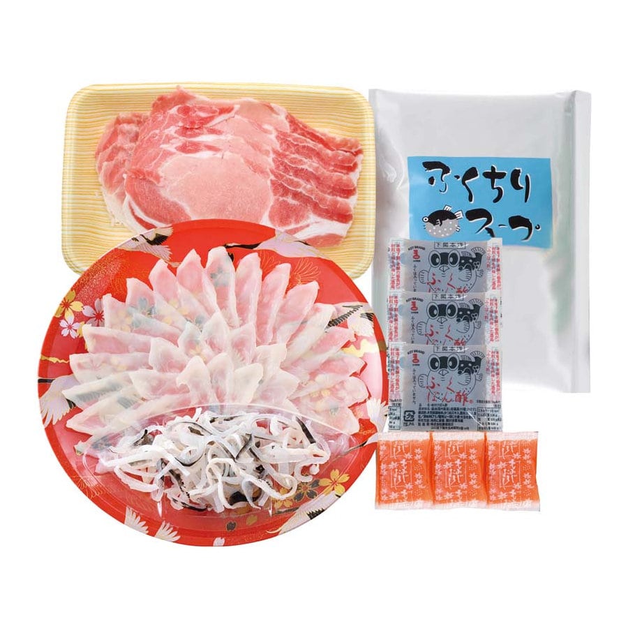 【セット内容】真ふぐ霜降り刺身しゃぶしゃぶ用(22cm皿)45g、とらふぐ皮20g、しゃぶしゃぶ用豚肉150g、ふぐちりスープ300g、ふくポン酢、もみじおろし各10g×各3(マフグ(山口県産原料を使用、山口県にて加工)、トラフグ(長崎県産、熊本県産:養殖原料を使用、山口県にて加工)、黒豚(鹿児島県産原料を使用、鹿児島県にて加工)、大根(国産原料を使用、山口県にて加工))