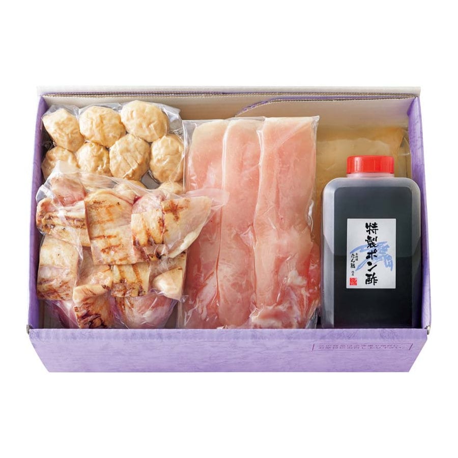 【セット内容】鶏もも肉(骨付き)240g、鶏むね肉160g、鶏つくね10個入、スープ1kg、ポン酢350g