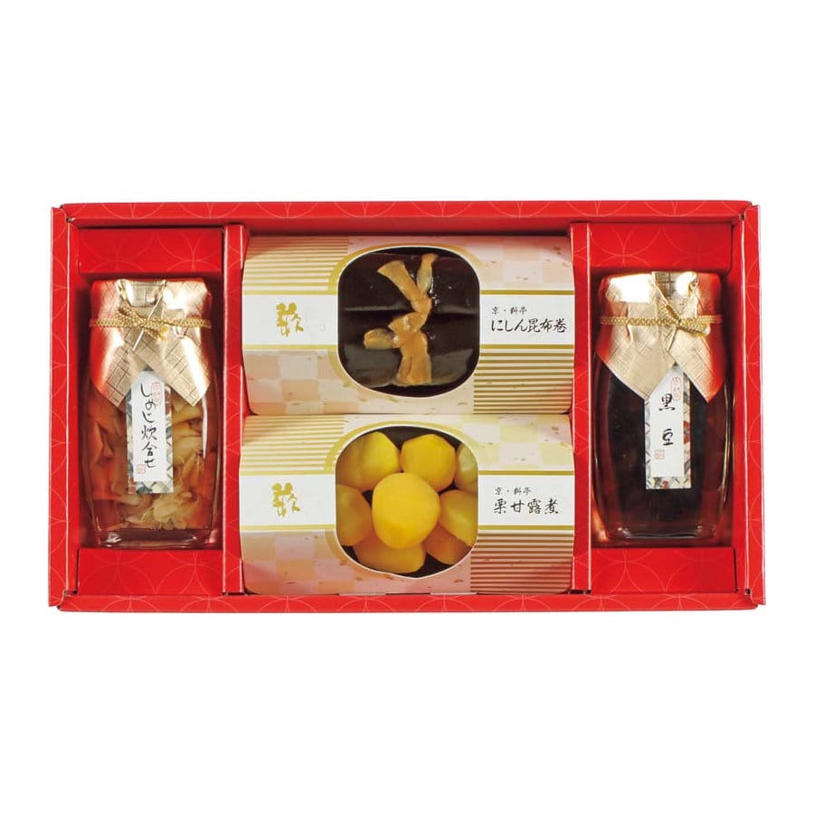 京都の料亭が作るおせち料理の贈り物です。丹波黒を使用した黒豆、しめじを使用した炊合せなどを華やかに詰め合わせております。
