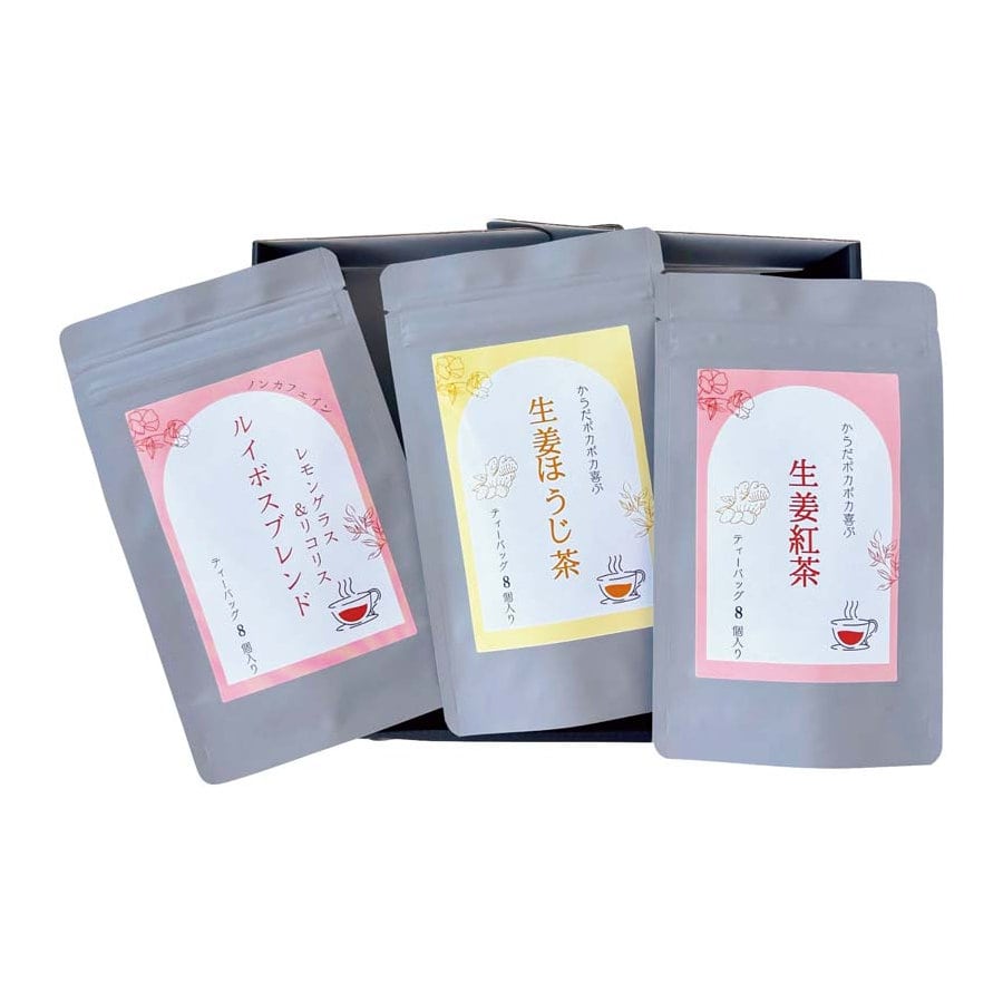 【セット内容】ルイボスブレンドティー3g×8個入り1袋、しょうがほうじ茶ティーバッグ3g×8個入り1袋、しょうが紅茶ティーバッグ3g×8個入り1袋