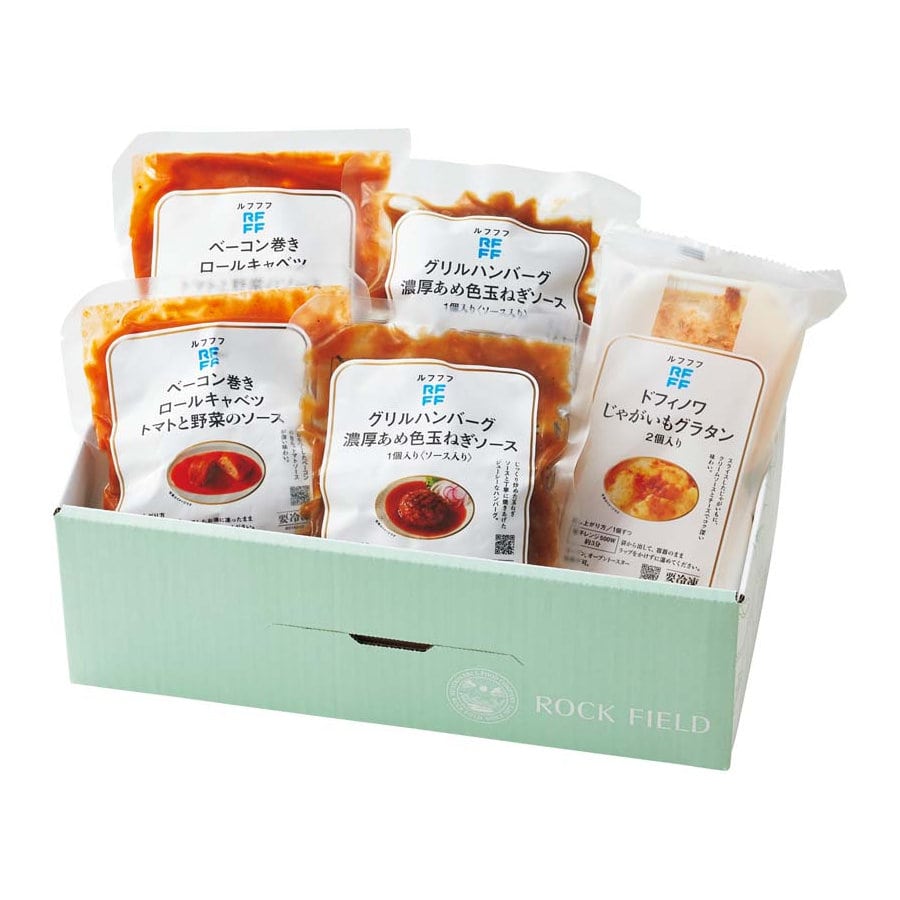 【セット内容】グリルハンバーグ濃厚あめ色玉ねぎソース160g(うち、ハンバーグ本体80g)×2、ベーコン巻きロールキャベツトマトと野菜のソース210g×2、ドフィノワじゃがいもグラタン2個入り200g