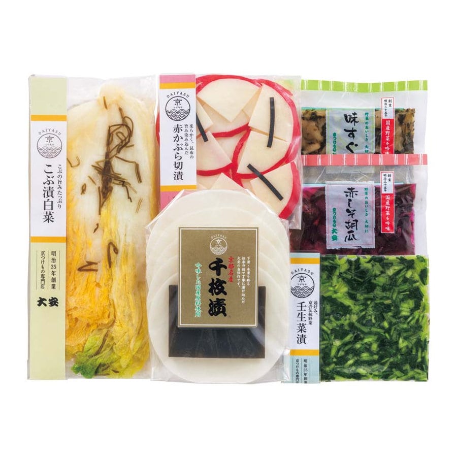 【セット内容】千枚漬70g、赤かぶら切漬62g、こぶ漬白菜132g、壬生菜漬、味すぐき、赤しそ胡瓜各40g