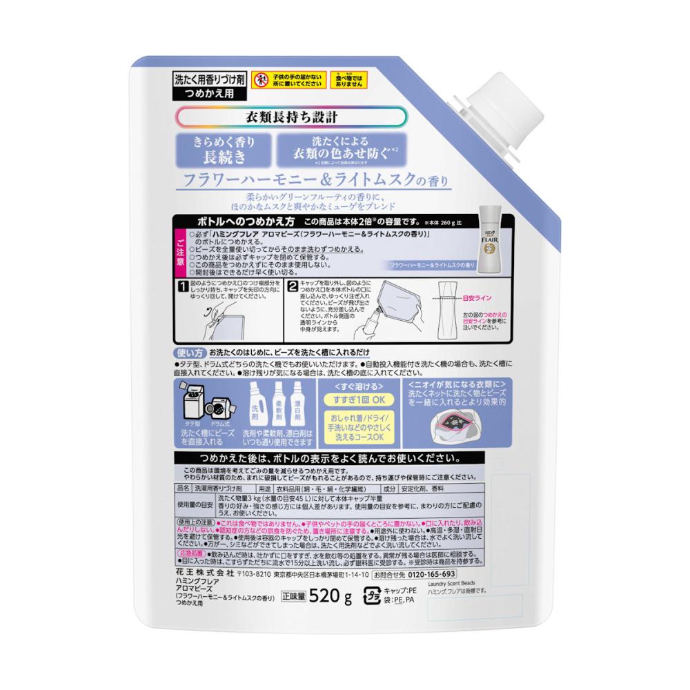 使用上の注意:ボトルへのつめかえ方 ご注意 ○必ず「ハミングフレア アロマビーズ (フラワーハーモニー&ライトムスクの香り)」のボトルにつめかえる。 ○ビーズを全量使い切ってからそのまま洗わずつめかえる。 ○つめかえ後は必ずキャップを閉めて保管する。 ○この商品をつめかえずにそのまま使用しない。 ○開封後はできるだけ早く使い切る。 使用上の注意 ●これは食べ物ではありません。 ●子供やペットの手の届くところに置かない。 ●口に入れたり、飲み込んだりしない。 ●認知症の方などの誤食を防ぐため、置き場所に注意する。 ●用途外に使わない。 ●高温・多湿・直射日光を避けて保管する。 ●使用後は容器のキャップをしっかり閉めて保管する。 ●溶け残った場合は、水でよく洗い流してください。 ●万が一、シミなどができてしまった場合は、洗たく用洗剤などでよく洗い流してください。