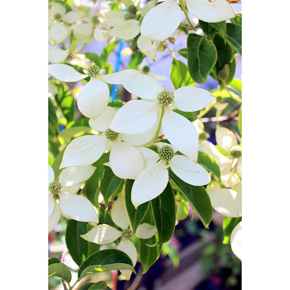 ■頭巾のような白い苞がポイント。秋に熟す赤い実は食べられることができます。ほとんど剪定しなくても自然に樹形が美しく整います。