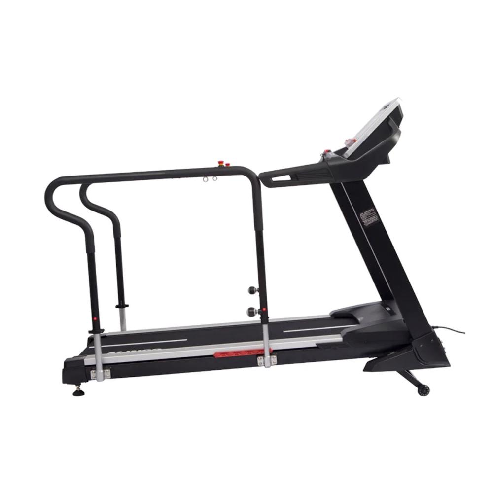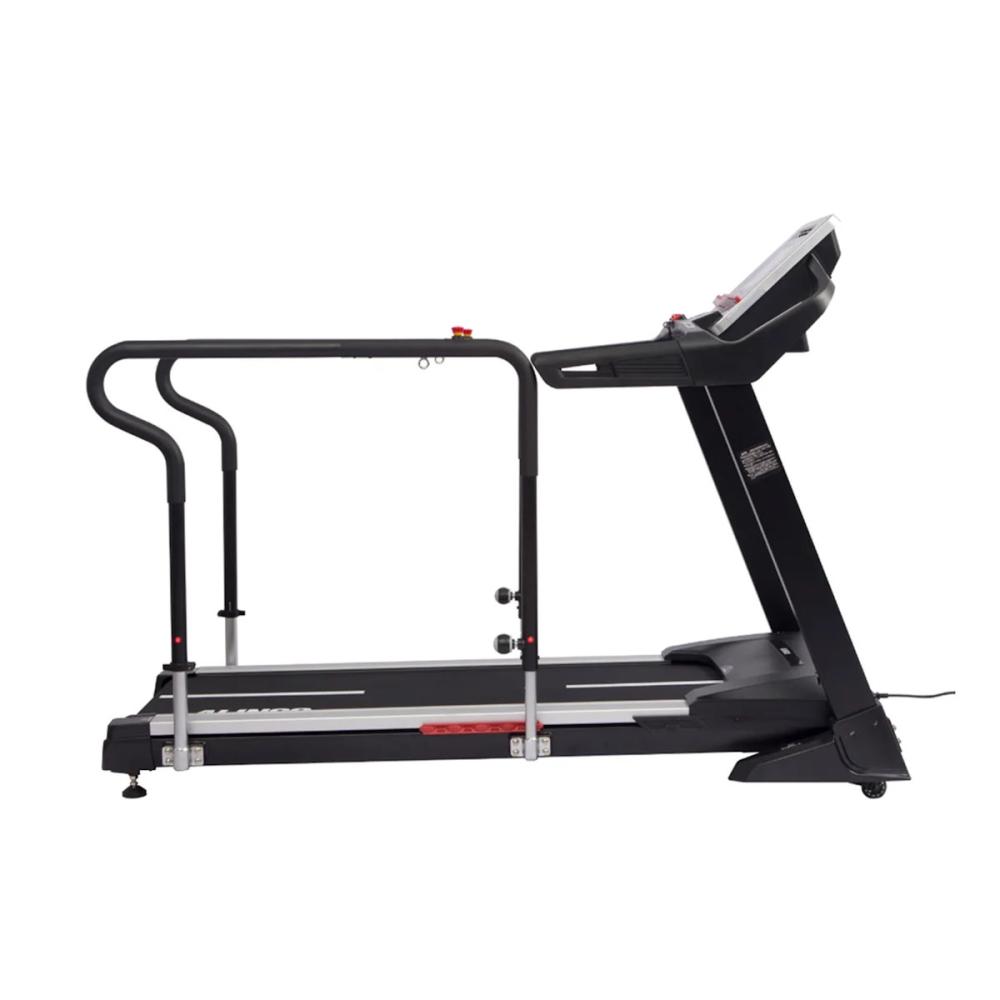 初速0.2km/h からでリハビリでの使用に適した速度設定が可能です。 歩行面が広いことで、足のもつれやバランスを崩すなどのトラブル防止でき、歩きやすくなっています。 ボタン操作で簡単に傾斜をつけることが出来ます。(電動傾斜:約1°~ 4°) バランス能力向上のために重要な後ろ歩きができるモードを搭載しています。(速度:1.0km/hまで) ハンドルはどの場所で歩いていても手すりが持てるように長く設計しています。 1回の運動に対する使用時間制限を設けていないので、施設でもお使いいただけます。