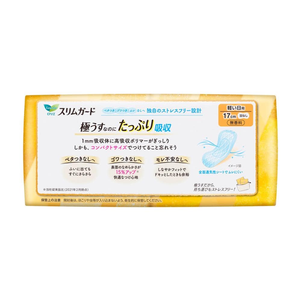 瞬間吸収のロリエ 極うすなのにたっぷり吸収 ベタつき ごわつき ムレなしへ 独自のストレスフリー設計 ●ふいに出てもすぐにさらさら ●表面のなめらかさ15%アップ※ 快適なつけ心地 ●しなやかフィットでドキッとしたときも余裕 ●全面通気性シートでムレにくい ●極うす&コンパクトで、持ち運びもストレスフリー ※当社従来品比(2021年2月時点)(医薬部外品)