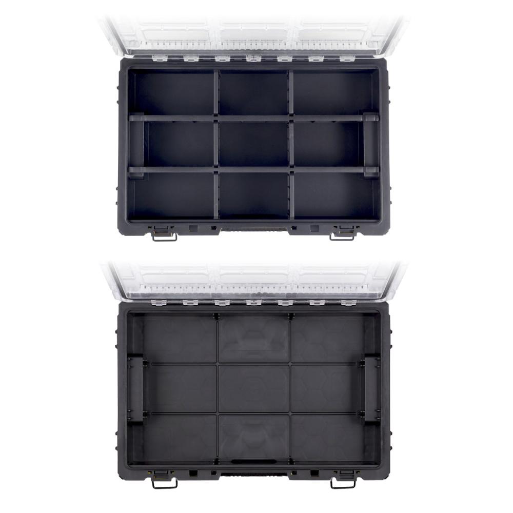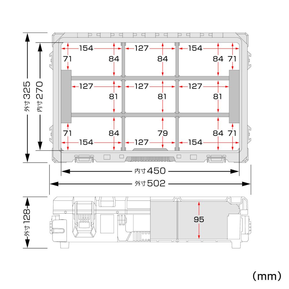 ●中身が見やすく衝撃にも強い透明カバー ●外側にセフホルダー機能(4個)を搭載した、工具や小型パーツの収納に適したツールボックス ●透明なトップカバーでフタを開けずに中身の確認が可能 ●重ねて置くだけでしっかりと連結する荷崩れ防止仕様 ●持ち運びが簡単なハンドル、付け外し可能な仕切りセット付