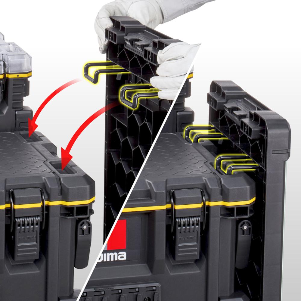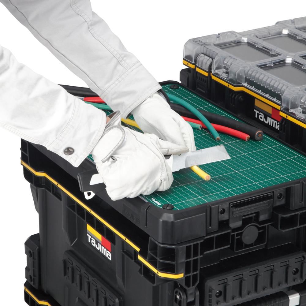 ●軽作業用のワークトップ ●裏面のフックで工具ボックスにも引っ掛けられます。 ●ボックスやバスケットに連結可能な軽作業用のワークトップ ●ビス等の転落を防ぐリブ付 ●ボックスや台車に掛けることができる収納式フック付 ●マットは目安目盛り付で、交換することが可能