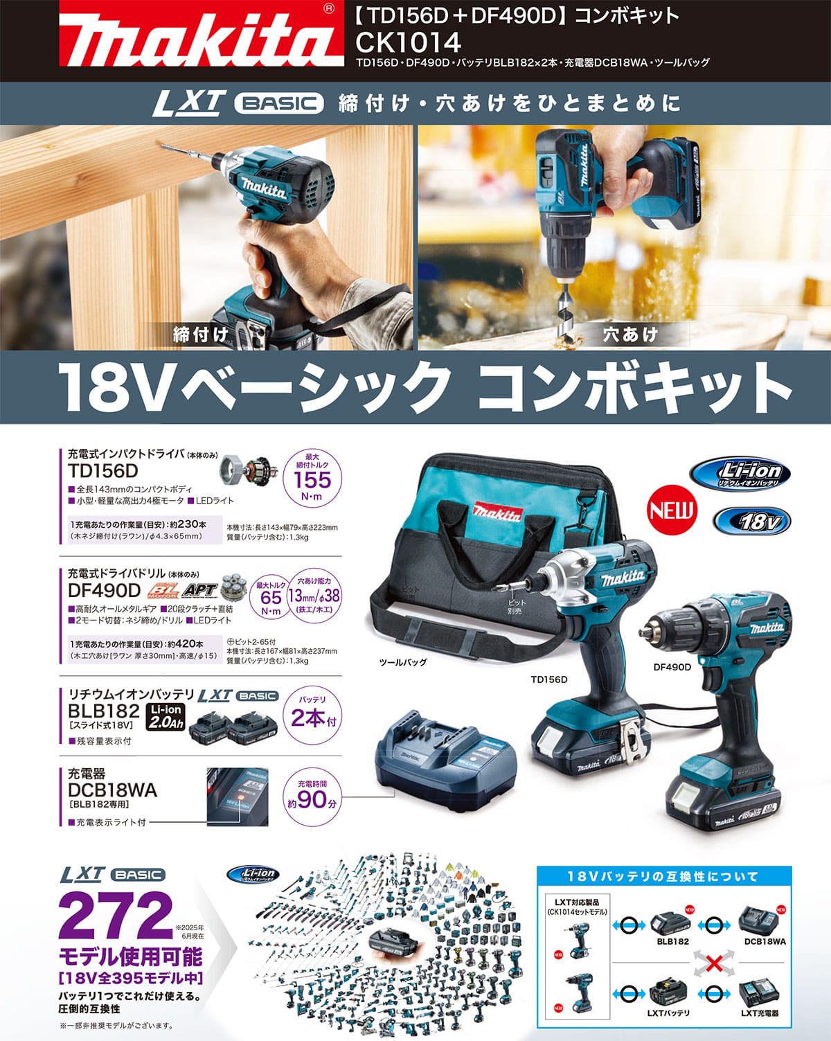 ●セット内容 ・充電式インパクトドライバTD156D ・充電式ドライバドリルDF490D ・18VベーシックバッテリBL182×2本 ・充電器DC18WA ・ツールバッグ ●商品スペック 【充電式インパクトドライバTD156D 本体のみ】 ・全長143mmのコンパクトボディ ・小型・軽量な高出力4極モータ ・1充電あたりの作業量(目安):約230本(木ネジ締付け(ラワン)/Φ4.3×65mm) ・最大締付トルク:155N・m ・本機寸法:長さ143×幅79×高さ223mm ・質量(バッテリ含む):1.3kg 【充電式ドライバドリルDF490D 本体のみ】 ・高耐久オールメタルギア ・20段クラッチ+直結 ・2モード切替:ネジ締め/ドリル ・LEDライト ・最大トルク:65N・m ・穴あけ能力:3mm/Φ38(鉄工/木工) ・本機寸法:長さ167×幅81×高さ237mm ・質量(バッテリ含む):1.3kg ・+ビット2-65付属 【リチウムイオンバッテリBLB182】 ・スライド式18V2.0Ah ・残容量表示付 【充電器DCB18WA】 ・充電表示ライト付 ・充電時間約90分