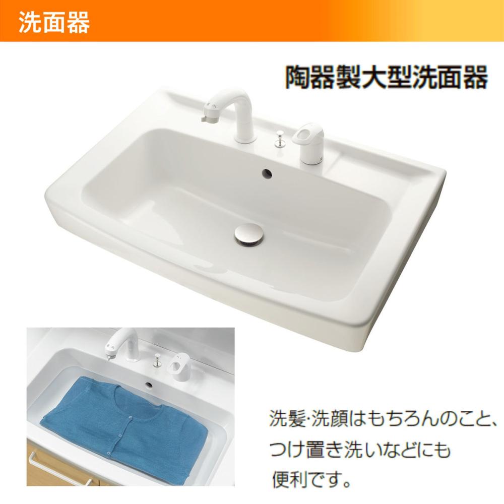 扉タイプ:片引出タイプ/カラー:クリエモカ/洗面ボウル:陶器(ピュアホワイト)/洗面ボウル容量:15L(幅75cm)/水栓:ホース引出式洗髪シャワー水栓/排水:プッシュワンウェイ排水栓、ヘアキャッチャー付き