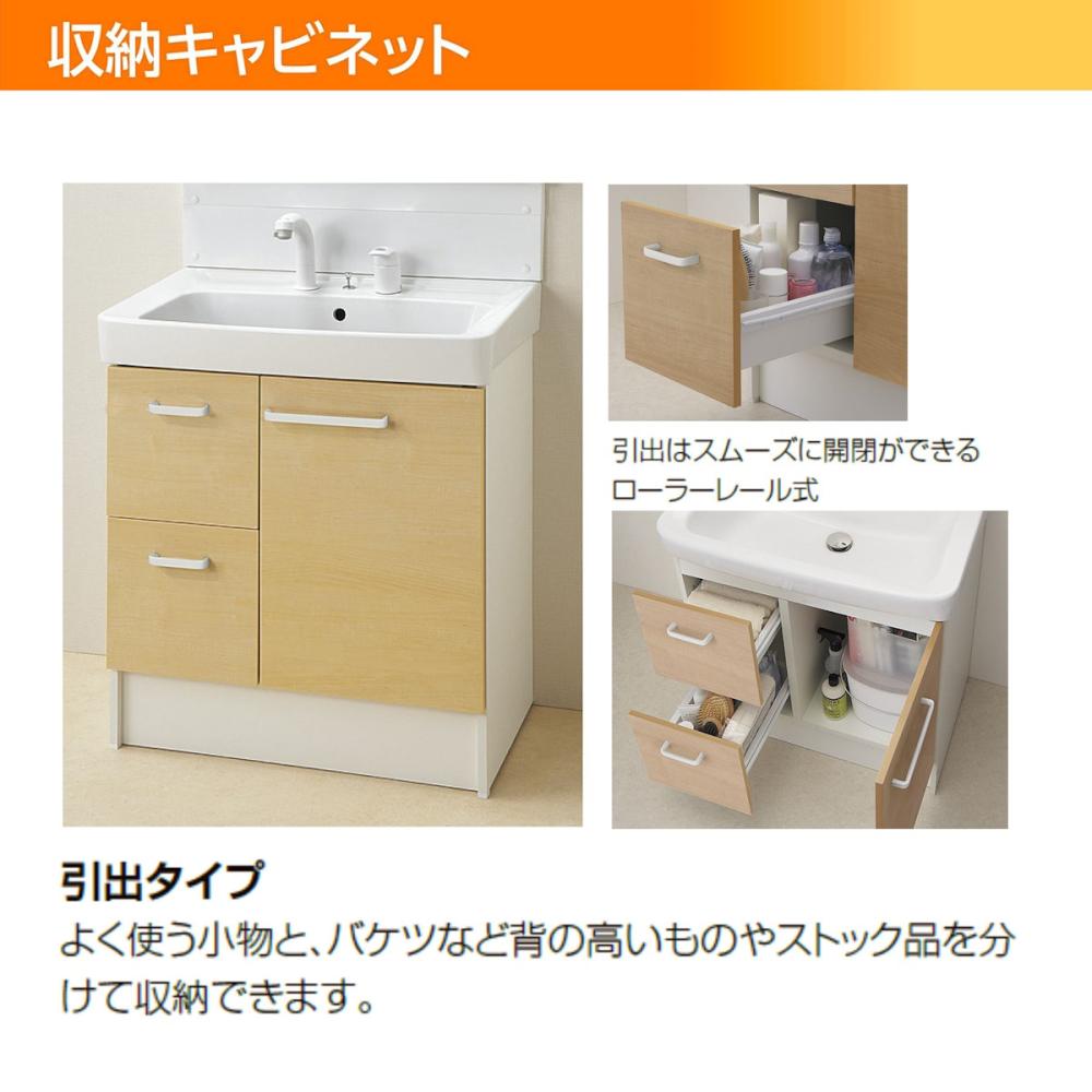扉タイプ:片引出タイプ/カラー:ホワイト/洗面ボウル:陶器(ピュアホワイト)/洗面ボウル容量:15L(幅75cm)/水栓:ホース引出式洗髪シャワー水栓/排水:プッシュワンウェイ排水栓、ヘアキャッチャー付き