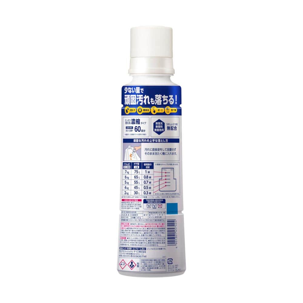 少ない量で頑固汚れも落ちる! 皮脂・汗、機械油、泥・土、食べ物汚れに。 作業着・ユニフォーム・コック服・軍手などのお洗たくにおすすめ。 たっぷり洗える濃縮タイプ。 この1本で洗たく回数*60回分。 うれしい3つの無配合「無蛍光・無香料・無着色料」。 *水量30L(洗剤約10mL使用)の場合