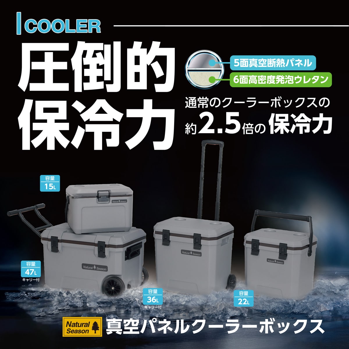 「Natural Season 真空パネルクーラーボックス」は、従来のクーラーボックスとは一線を画す、圧倒的な保冷力を誇ります。その秘密は、高性能な真空パネル。これにより、通常のクーラーボックスの約2.5倍という驚異的な保冷力を実現しました。