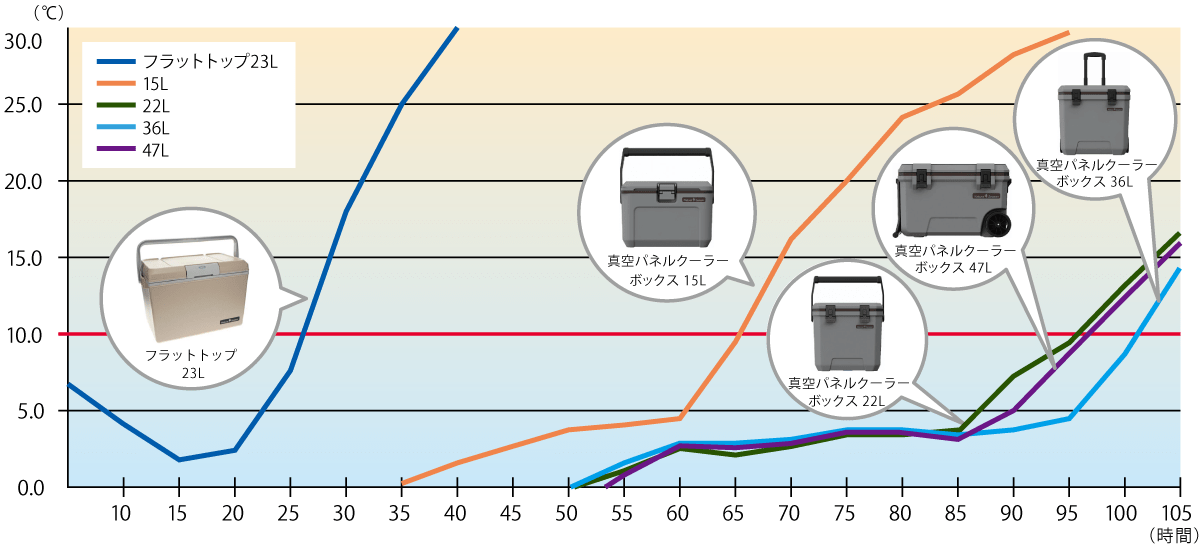 当社調べ: クーラーボックス内に容量の約40%の氷を入れ、室温40℃±2℃の環境下に置き、クーラーボックス内の水温を測り、水温が10℃に達するまでの時間