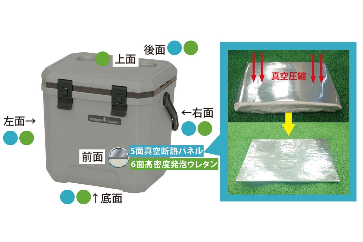 クーラーボックスの前面・後面・左面・右面、そして地面からの熱を受けやすい底面の計5面に、断熱性能に極めて優れた「真空パネル」を採用しました。