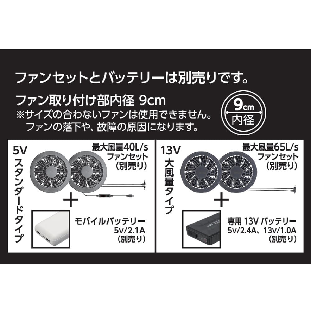 ●ファンとバッテリーは別売です。(ファン取り付け部内径9cm)