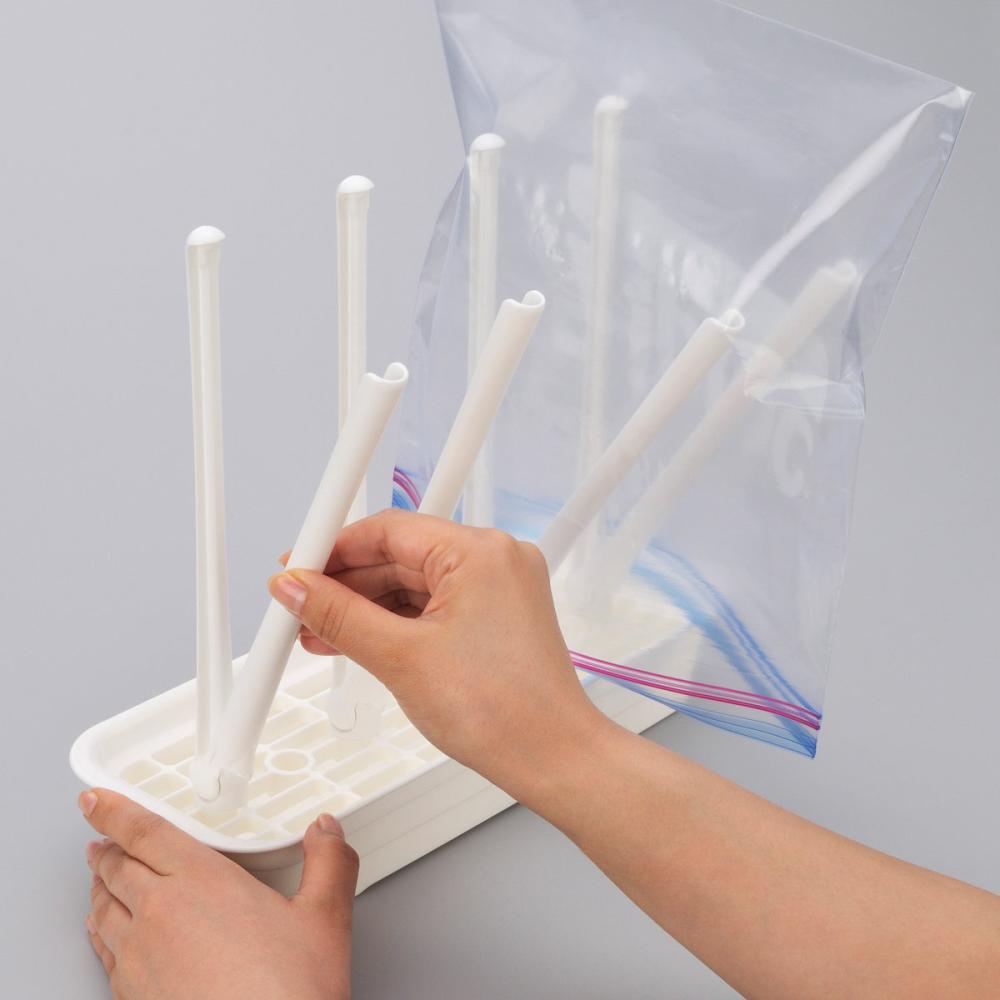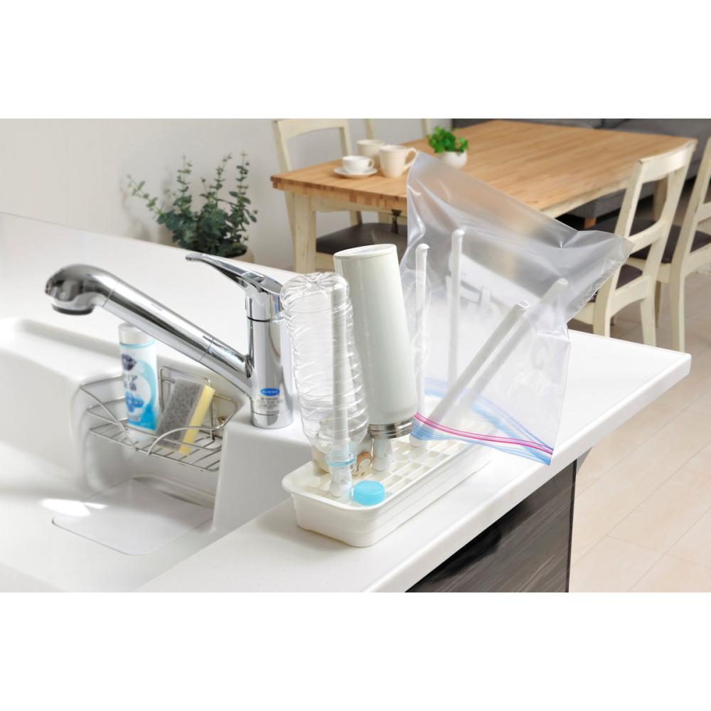 ■コップや水筒、保存袋等、一人暮らしの使用シーンに適したコンパクトな水切りです。