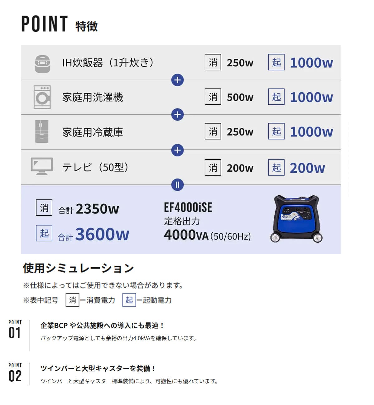 ●「優れた大容量出力、耐久性、静粛性を備えた発電機」