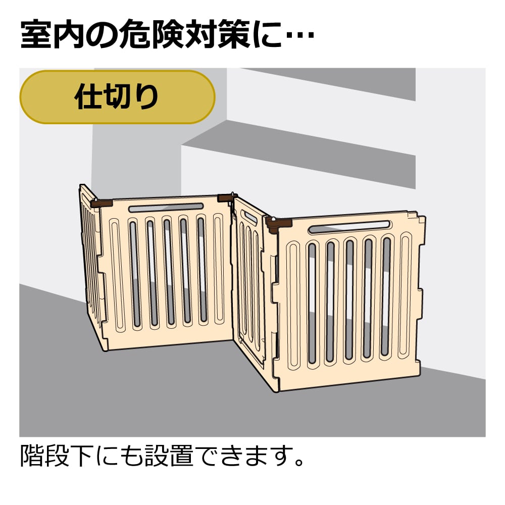 お取り扱い上の注意:●本品は犬の通行を完全に防げるものではありません。犬が乗り越えても、人身・物損などの事故が発生しない場所に設置してください。 ●用途以外では使用しないでください。 ●犬が雷などの音や光、あるいは他の動物の出現に対し思わぬ行動をとるかもしれません。ケガや死亡にいたるおそれがありますので、そのような場合は犬から目をはなさないよう付き添っていてください。お出かけの際はなるべくドアを開放して、犬を閉じこめないようにしてください。 ●ドアの開閉・開放時以外は必ずドアをロックしておいてください。犬が飛び出し、思わぬ事故の原因となります。 ●各部品が正しく取り付けられていない場合、製品の間に犬が挟まり重大な事故につながるおそれがありますので注意してください。 ●本品を改造しての使用や、部品の代用はしないでください。事故や故障の原因となります。 ●暖房機の熱風吹出口の前や火のそばなどに設置しないでください。ヤケドや製品の破損の原因となります。 ●犬にリードをつけたまま使用しないでください。本品にリードが引っ掛かり思わぬ事故がおきるおそれがあります。 ●本品に腰かけたり、寄りかかったり、ドアにぶら下がらないでください。事故や故障の原因となります。 ●本品の設置場所は平坦で安定した床面に設置してください。 ●本品や設置場所などに異常があるときは、直ちに使用を中止してください。 ●元気な犬の場合、サークル内で立ち上がって扉パネルを強く押すとサークルが前方へ倒れ、ケガをするおそれがあります。目の届く場所で使用してください。 ●本品は構造上、下部にフレームがあります。つまずかないように注意してください。 ●本品を階段の階上付近やガラス戸の近くなど、本品が倒れた場合に危険だと思われる所には設置しないでください。 ●本品をまたいで通り抜けないでください。つまずいて転倒する危険があります。 ●子供も大人も、弱い光のもと・暗いところでは、本品につまずく可能性があります。このようなところで起こりうるつまずきによる事故を回避するために、本品のそばに終夜灯を置いてください。