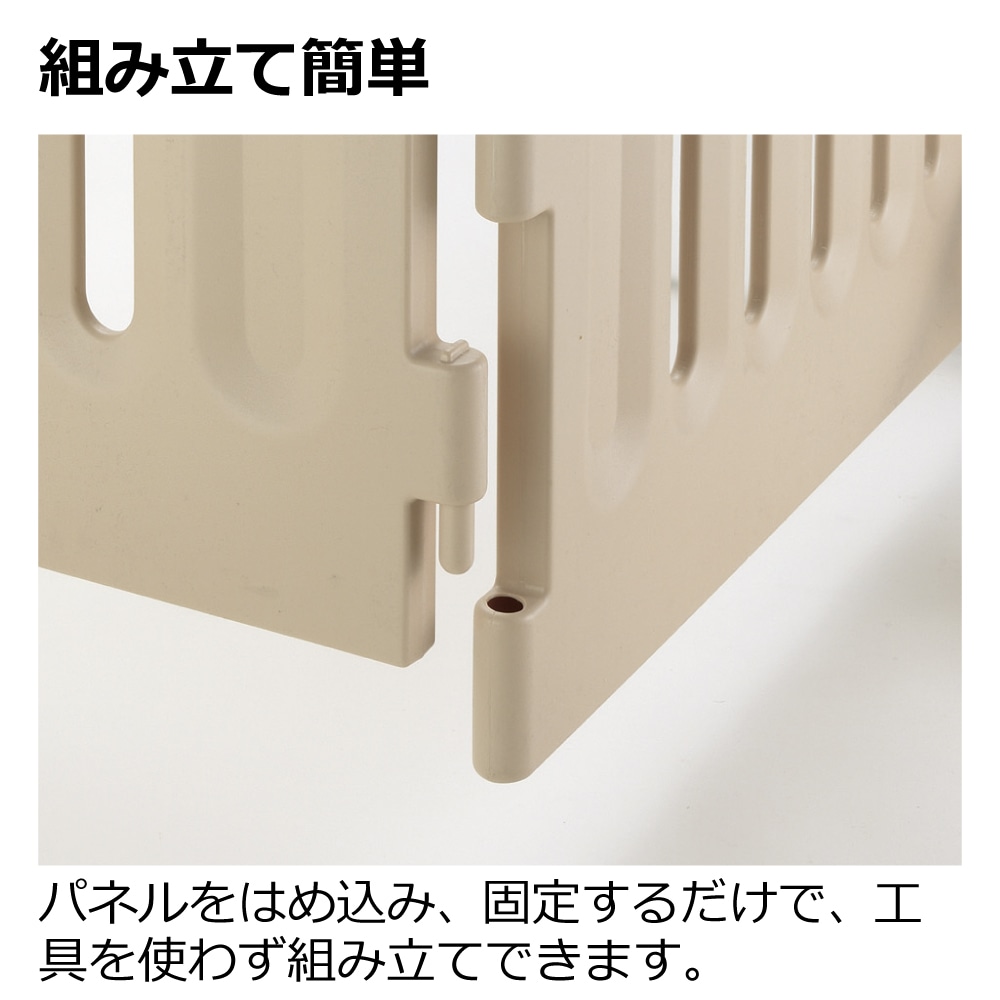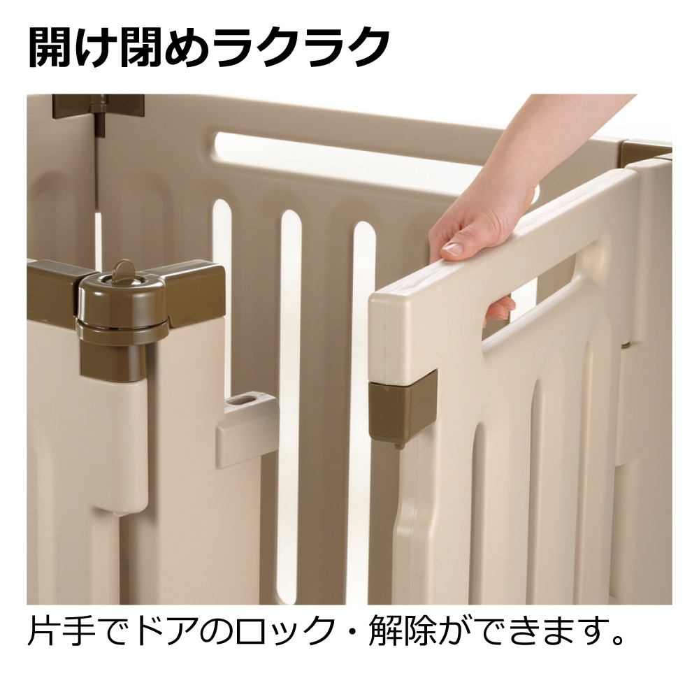 お取り扱い上の注意:●本品は犬の通行を完全に防げるものではありません。犬が乗り越えても、人身・物損などの事故が発生しない場所に設置してください。 ●用途以外では使用しないでください。 ●犬が雷などの音や光、あるいは他の動物の出現に対し思わぬ行動をとるかもしれません。ケガや死亡にいたるおそれがありますので、そのような場合は犬から目をはなさないよう付き添っていてください。お出かけの際はなるべくドアを開放して、犬を閉じこめないようにしてください。 ●ドアの開閉・開放時以外は必ずドアをロックしておいてください。犬が飛び出し、思わぬ事故の原因となります。 ●各部品が正しく取り付けられていない場合、製品の間に犬が挟まり重大な事故につながるおそれがありますので注意してください。 ●本品を改造しての使用や、部品の代用はしないでください。事故や故障の原因となります。 ●暖房機の熱風吹出口の前や火のそばなどに設置しないでください。ヤケドや製品の破損の原因となります。 ●犬にリードをつけたまま使用しないでください。本品にリードが引っ掛かり思わぬ事故がおきるおそれがあります。 ●本品に腰かけたり、寄りかかったり、ドアにぶら下がらないでください。事故や故障の原因となります。 ●本品の設置場所は平坦で安定した床面に設置してください。 ●本品や設置場所などに異常があるときは、直ちに使用を中止してください。 ●元気な犬の場合、サークル内で立ち上がって扉パネルを強く押すとサークルが前方へ倒れ、ケガをするおそれがあります。目の届く場所で使用してください。 ●本品は構造上、下部にフレームがあります。つまずかないように注意してください。 ●本品を階段の階上付近やガラス戸の近くなど、本品が倒れた場合に危険だと思われる所には設置しないでください。 ●本品をまたいで通り抜けないでください。つまずいて転倒する危険があります。 ●子供も大人も、弱い光のもと・暗いところでは、本品につまずく可能性があります。このようなところで起こりうるつまずきによる事故を回避するために、本品のそばに終夜灯を置いてください。