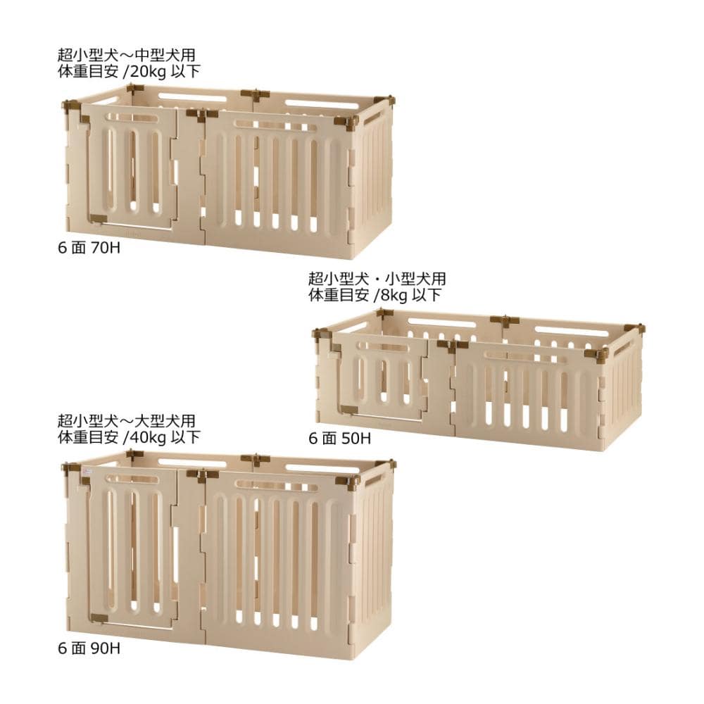 サークル時:162×84×91.5H(cm)、六角形サークル時:162×141×91.5H(cm)、コの字型ゲート時:318.5×82.5×91.5H(cm)、蛇腹型ゲート時:334×61×91.5H(cm)、サークル内寸:153×75(cm)、扉面間口幅:46.5(cm)