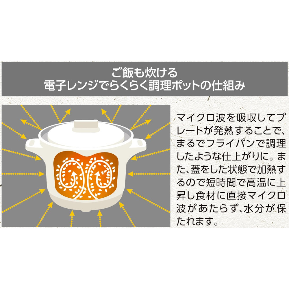 マイクロ波を吸収してプレートが発熱することで、まるでフライパンで調理したような仕上がりに。また、フタをした状態で加熱するので短時間で高温に上昇し、食材に直接マイクロ波があたらず水分が保たれます。