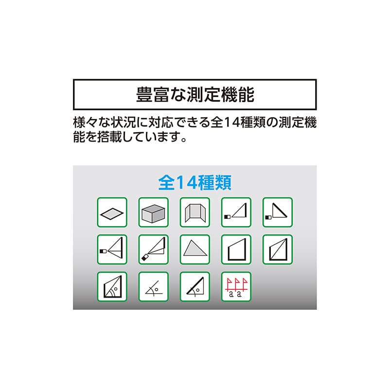 【用途】 建築現場や改装工事など面積の広い建物の距離測定に。屋内、屋外の距離測定に。 【特徴】 ・Bluetooth通信機能付で、測定値をスマートフォンやタブレット、パソコンに送信できます。 ・本体内蔵Bluetoothで、専用の受信機や送信機は不要です。 ・屋外でも測定できます。 ・測定箇所がわかりやすいファインダー付です。 ・角度測定機能付です。 ・防塵・防水性能 保護等級IP54で水やほこりに強い設計です。 ・ボタンを押した時に生じる手ブレを防ぐ、5秒カウントダウン測定機能付です。
