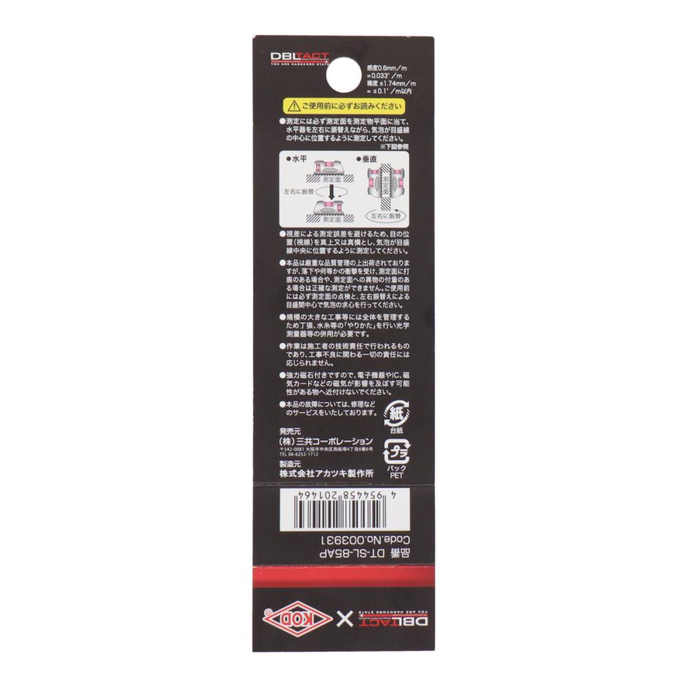 ●DBLTACTとKODのコラボレーションカラー 【用途】 ●水平測定 ●垂直測定 【仕様】 ●気泡管 ●感度:0.6mm/m=0.033°/m ●精度:±1.74mm/m=±0.1°/m以内