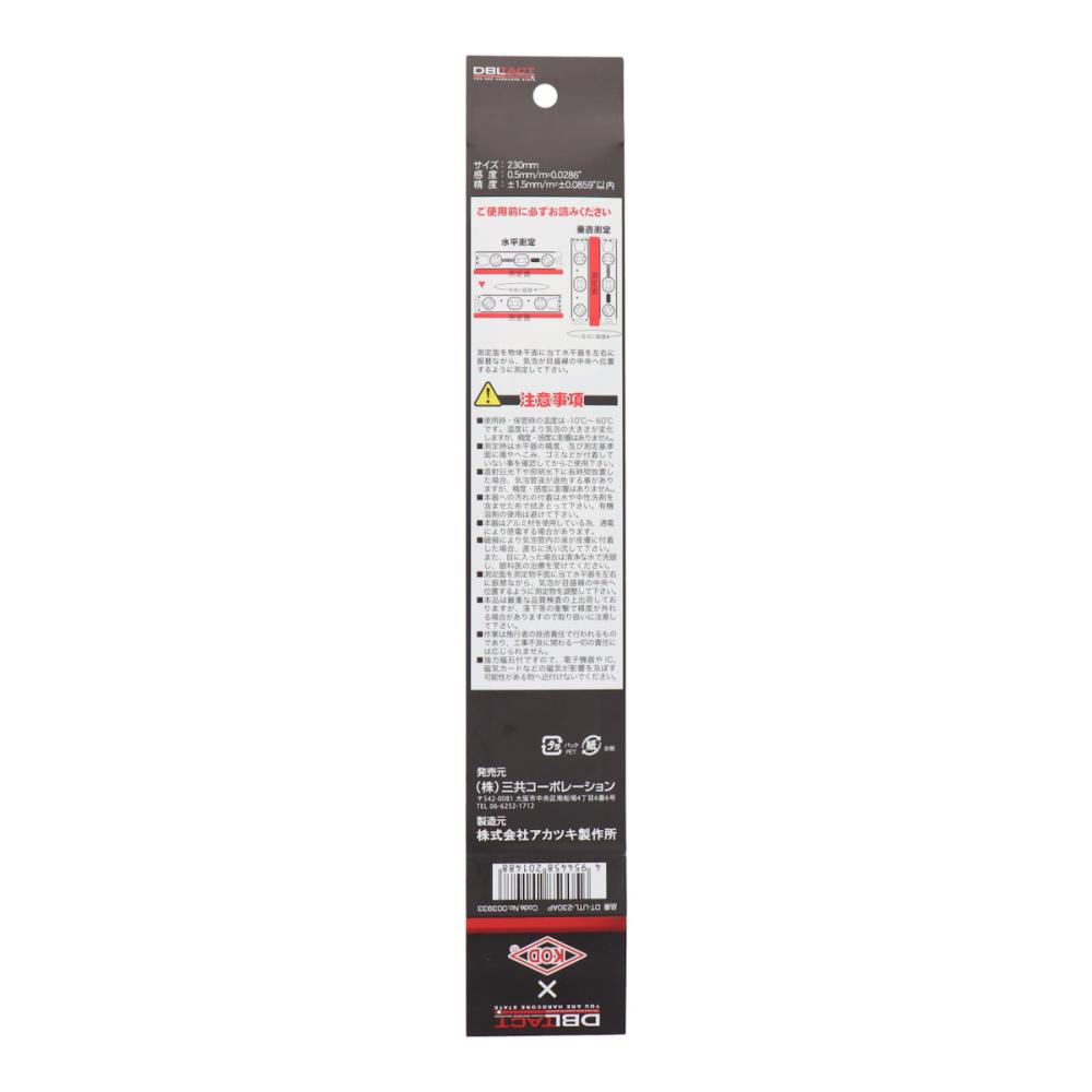 ●DBLTACTとKODのコラボレーションカラー! ●職人~DIYと幅広いユーザーに使用されています! 【特長】 ●カラビナを着脱しやすい大型通し孔 ●腰袋に収納しやすい流線型 【仕様】 ●気泡管 ●感度:0.5mm/m=0.0286° ●精度:±1.5mm/m=±0.0859°以内